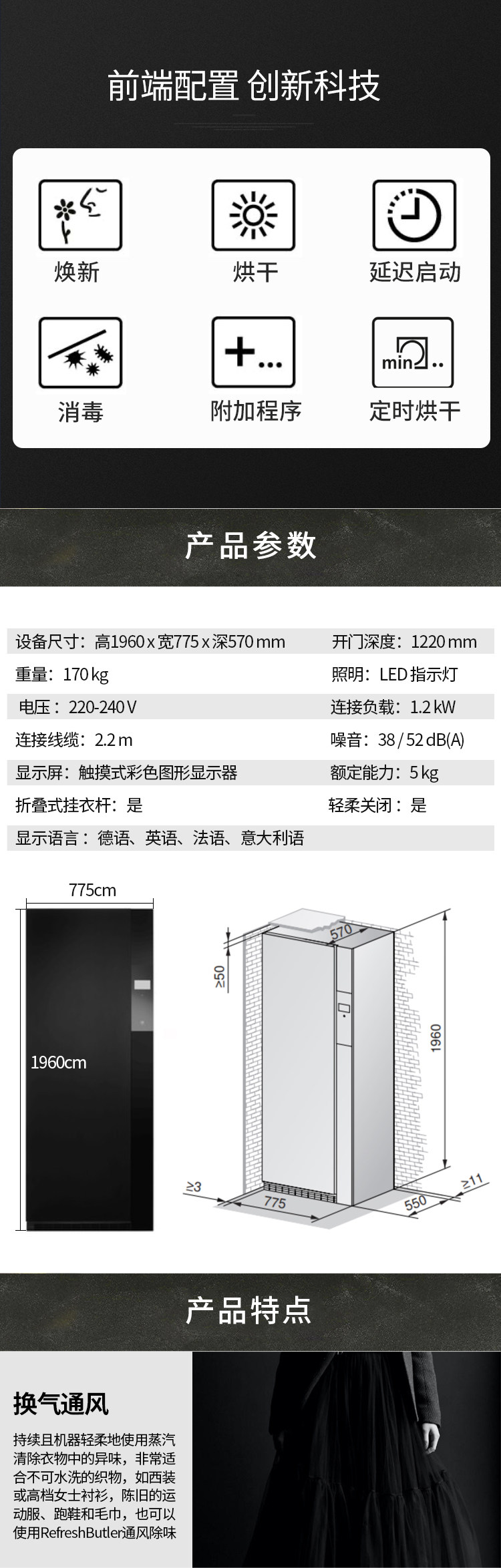 V-ZUG RefreshButler 为精致的织物提供合适的护理。轻柔地烘干织物,用蒸汽通风除味,或者通过卫生程序清除病菌和细菌。此外还通过除皱功能明显减少褶皱。